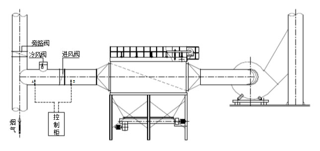 煙氣溫度一旦高于除塵器正常使用溫度,自動控溫裝置啟動冷風(fēng)閥,放進(jìn)冷風(fēng),同時(shí)電鈴自動報(bào)警,提示操作工采取降溫措施;當(dāng)煙氣溫度降至正常使用溫度時(shí),冷風(fēng)閥自動關(guān)閉,操作也恢復(fù)正常;當(dāng)采取放冷風(fēng)后,煙氣溫度仍超過除塵器的允許O高溫度時(shí),進(jìn)風(fēng)閥會自動關(guān)閉,旁路閥打開,煙氣進(jìn)入旁路煙道排空,確保除塵器的安全運(yùn)行。