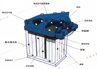 含塵空氣由風(fēng)口進(jìn)入除塵器箱體內(nèi),細(xì)小塵粒由于濾袋的多種效應(yīng)作用,被滯阻在濾袋外壁。凈化后的氣體通過(guò)濾袋從上箱體出風(fēng)口排出。隨著使用時(shí)間的增長(zhǎng),濾袋表面吸附的粉塵增多,濾袋的透氣性減弱,使除塵器阻力不斷增大。為保證除塵器的阻力控制在限定的范圍之內(nèi),由脈沖控制儀發(fā)出信號(hào),循序打開電磁脈沖閥,使氣包內(nèi)的壓縮空氣由噴吹管各噴射到對(duì)應(yīng)的骨架(稱為一次風(fēng)),并在高速氣流通過(guò)骨架時(shí)誘導(dǎo)數(shù)倍于一次風(fēng)的周圍空氣(稱為二次風(fēng))進(jìn)入濾袋,造成濾袋瞬間急劇膨脹,由于反向脈沖氣流的沖擊作用很快消失,濾袋又急劇收縮,這樣使積附在濾袋外壁上的粉塵被清除。由于清灰是依次分別向幾組濾袋進(jìn)行,并不切斷需要處理的含塵空氣,所以在清灰過(guò)程中,除塵器的處理能力保持不變。