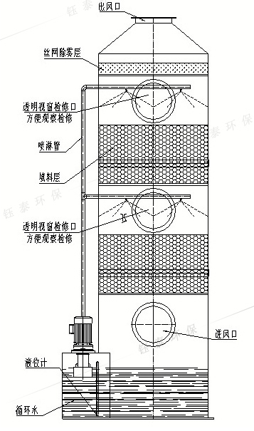 通過水循環(huán)噴霧,氣體從下方上升,水從上到下循環(huán)過濾廢氣中的灰塵和雜質(zhì)并通過中和反應(yīng)和水來處理廢氣。洗滌器處理酸堿廢氣一般可以達(dá)到90%以上的效果。