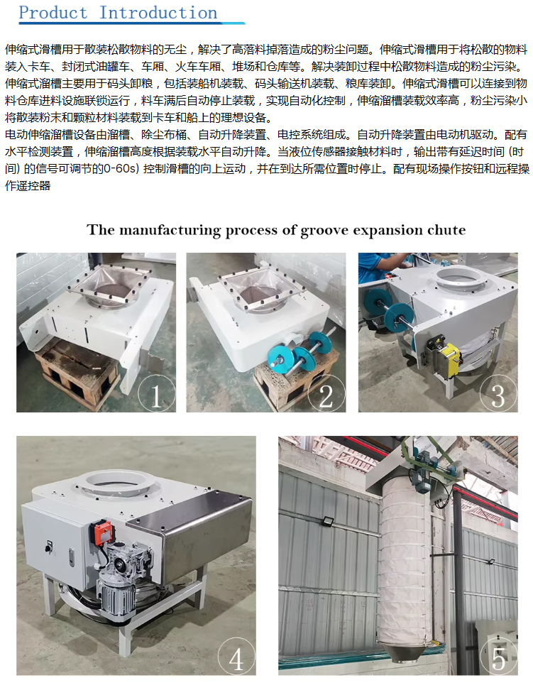 伸縮式卸料管的優勢:1.無塵裝載:我們的裝載系統確保工作區域無塵,防止污染并確保港口和環境的安全。2.多功能性:適用于各種散裝固體輸送和儲存系統。無論您使用的是料倉、漏斗、螺旋